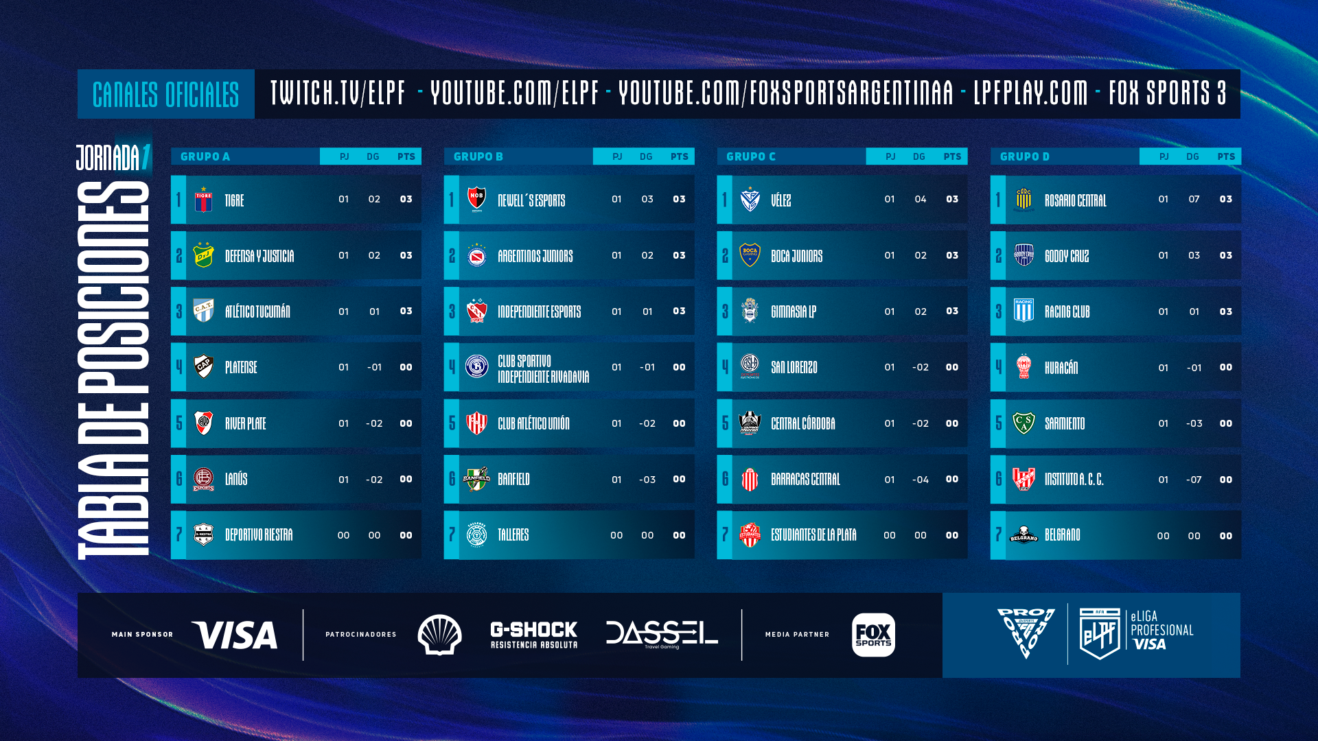 - La eLPF VISA 2024 dio inicio a la fase de grupos el pasado viernes 16 de febrero con su primera jornada, mientras que ayer cerró la semana con la segunda fecha. Tigre y Defensa y Justicia dominan el grupo A, mientras que Newell´s Esports lidera el grupo B, en soledad. Además, Vélez y Rosario Central escalan a la cima de los grupos C y D, respectivamente.